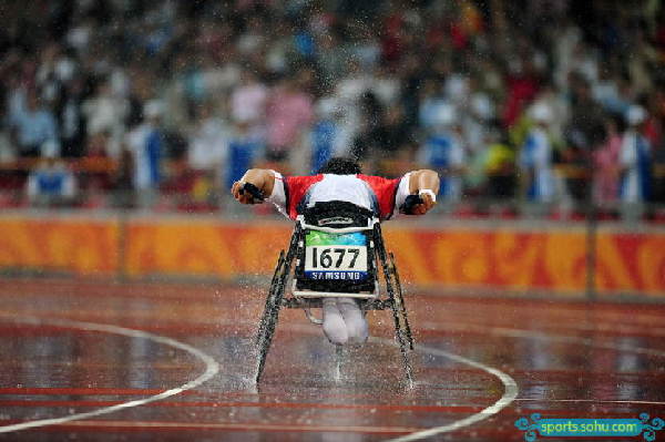 9日,日本選手寒川進在男子400米T53級首輪比賽中。北京2008年殘奧會田徑比賽在國家體育場冒雨進行。新華社/圖