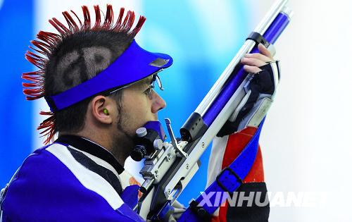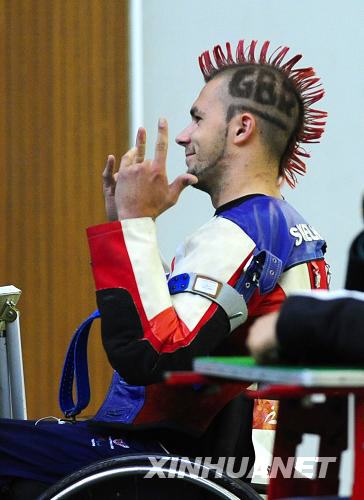 9月11日,英國選手馬特·斯克爾霍恩在賽后慶祝勝利。當日,在北京2008年殘奧會R3混合組10米氣步槍臥射--SH1決賽中,馬特·斯克爾霍恩以704.9環的總成績獲得冠軍。 新華社記者任勇攝