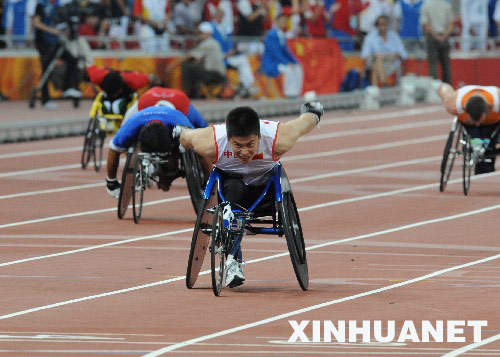 9月10日,中國(guó)選手張立新在比賽中角逐。在北京2008年殘奧會(huì)男子400米T54級(jí)決賽中,張立新以45秒07的成績(jī)奪冠并打破世界紀(jì)錄。新華社記者陳樹根攝