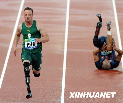9月9日,南非選手皮斯托瑞斯(左)在比賽中沖向終點(diǎn)。當(dāng)日,在國(guó)家體育場(chǎng)進(jìn)行的北京2008年殘奧會(huì)男子100米T44級(jí)決賽中,有“刀鋒戰(zhàn)士”之稱的南非著名殘疾人運(yùn)動(dòng)員皮斯托瑞斯以11秒17的成績(jī)奪得冠軍。新華社記者李文攝