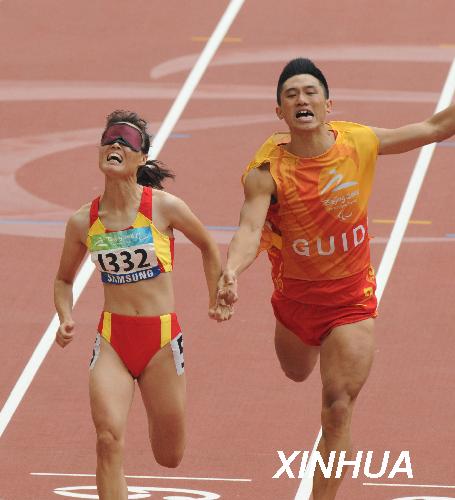 9月9日,中國(guó)選手吳春苗(左)與領(lǐng)跑員在比賽中。當(dāng)日,在國(guó)家體育場(chǎng)進(jìn)行的北京2008年殘奧會(huì)女子100米T11級(jí)決賽中,吳春苗以12秒31的成績(jī)奪得冠軍。新華社記者李文攝