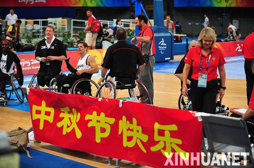 9月14日,加拿大隊球員在北京2008年殘奧會輪椅籃球比賽中打出“中秋節快樂”的橫幅。當日,中國農歷八月十五,是中華民族傳統節日中秋佳節。中秋之夜,皓月當空,銀輝遍灑北京城。燦爛月華之下,“鳥巢”氣象萬千,“水立方”如夢如幻,多少夢想,在此升騰……來自世界各地的運動員、教練員、工作人員、記者和觀眾歡聚在北京,共享明月之夜,共敘團圓之情。運動員們在賽場上為了夢想頑強拼搏,超越自我;工作人員、志愿者和記者們堅守崗位,辛勤工作;觀眾們盡情地吶喊助威,為殘疾人運動員獻上崇高的敬意。“海上生明月,天涯共此時”。中秋之夜,不論離家千里萬里,北京殘奧會讓每一位參與其中的人,都沐浴在濃濃的大家庭氛圍中。新華社記者李紫恒攝