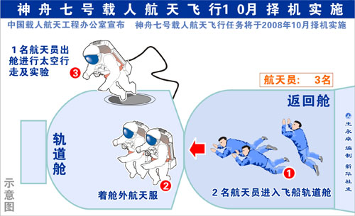 神舟七號(hào)作為我國(guó)載人航天工程二期首次飛行,航天員空間出艙活動(dòng)將成為最大突破。專家們制定了有害氣體控制等30多項(xiàng)出艙期間的應(yīng)急預(yù)案來(lái)保證航天員安全,而使航天員從艙內(nèi)環(huán)境過(guò)度到艙外真空環(huán)境的飛船氣閘艙,由我國(guó)自主研制,首次投入使用。