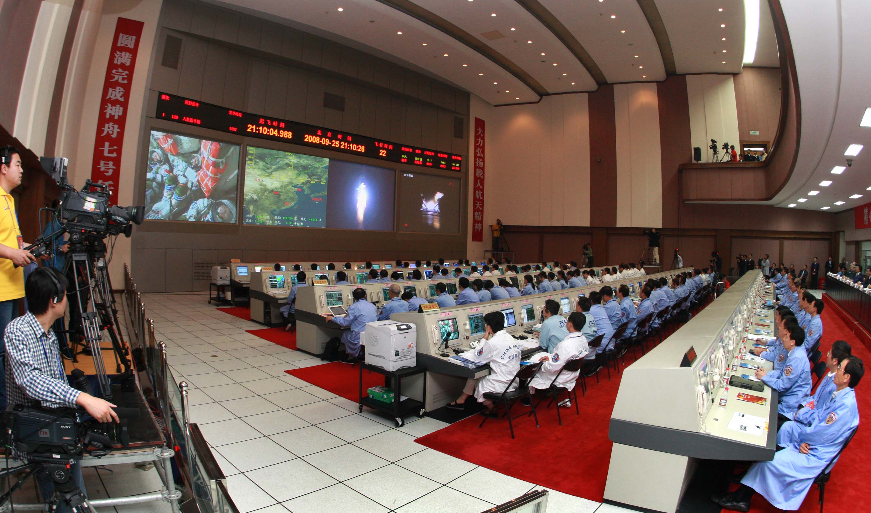 9月25日晚,在北京航天飛行控制中心,總調度在緊張工作。當日21時10分,長征二號F型運載火箭點火,神舟七號飛船在酒泉衛星發射中心升空。