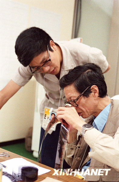 新華社記者胡越(右)與高殿民在第24屆奧運會上用放大鏡觀看底片(攝于1988年9月)。新華社發(fā)(資料照片)