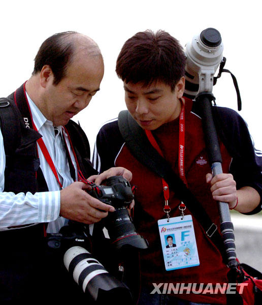 新華社攝影記者在南京賽馬場采訪時一起觀看數(shù)碼相機拍攝的照片(2005年10月17日攝)。新華社發(fā)