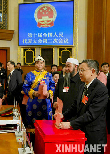 這是2004年3月14日,出席十屆全國人大二次會議的代表們投票表決中華人民共和國憲法修正案草案。會議審議通過的憲法修正案將“三個代表”重要思想、尊重和保障人權(quán)、保護(hù)合法私有財產(chǎn)等內(nèi)容寫入憲法,充分體現(xiàn)以人為本理念。新華社發(fā)