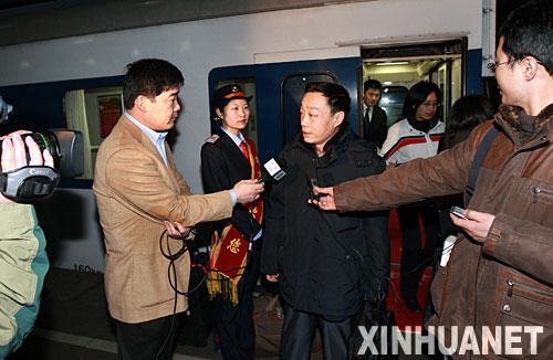 2月28日,剛下列車的全國政協委員牛立文在接受記者采訪。當日,安徽省出席全國政協十一屆一次會議的全國政協委員乘坐Z74次列車抵達北京火車站。新華社記者龐興雷攝