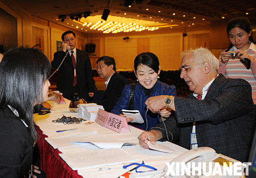 2月29日,一名外國通訊社記者(前右)在北京梅地亞中心的兩會新聞中心領取采訪證件。當日,參加兩會報道的境內外記者開始報到。 新華社記者 黃敬文攝