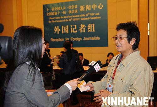 2月29日,一名外國通訊社記者(右)在北京梅地亞兩會新聞中心接受記者采訪。當日,參加兩會報道的境內外記者開始報到。 新華社記者 黃敬文攝