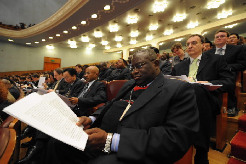 中國日報網(wǎng)站環(huán)球在線消息:3月5日,第十一屆全國人民代表大會第一次會議在北京人民大會堂開幕。這是外國使節(jié)旁聽會議。(圖片來源:新華社)