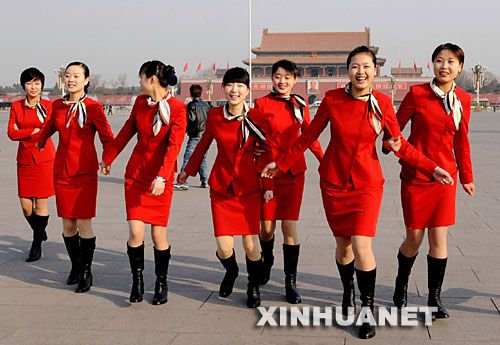 3月5日,第十一屆全國人民代表大會(huì)第一次會(huì)議在北京人民大會(huì)堂開幕。代表們進(jìn)場(chǎng)后,為他們服務(wù)的工作人員利用空閑在天安門廣場(chǎng)合影。新華社記者朱祥攝
