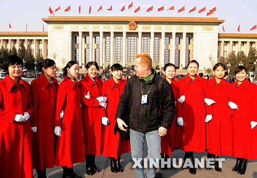 3月5日,第十一屆全國人民代表大會第一次會議在北京人民大會堂開幕。代表們進場后,為他們服務的工作人員利用空閑在人民大會堂前合影時,一名外國記者也來湊熱鬧。新華社記者楊宗友攝