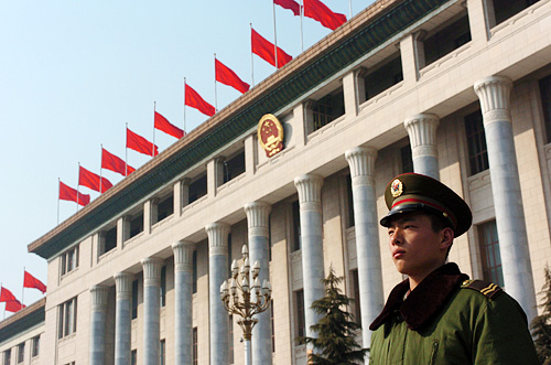 3月5日,第十一屆全國人民代表大會第一次會議在北京人民大會堂開幕。這是當(dāng)日在大會堂南門值勤的解放軍戰(zhàn)士。新華網(wǎng) 陳競超攝