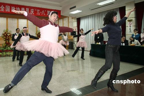男性政協委員裝扮成小天鵝向女政協委員表示節日祝賀。