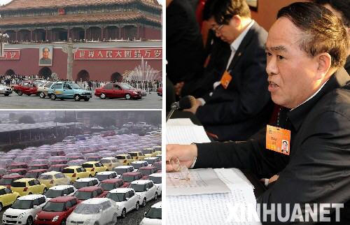 (右圖)全國政協委員、中國工程院院士曹湘洪針對目前節油型汽車、小排量汽車使用萎縮現象,建議國家制定相應的價格、稅收政策,在全社會倡導“理性消費”。新華社記者宋振平攝 [影像鏈接] (左上圖)小排量轎車行駛在北京長安街上。(左下圖)整裝待發的長安汽車集團小排量汽車。新華社發(資料照片)。