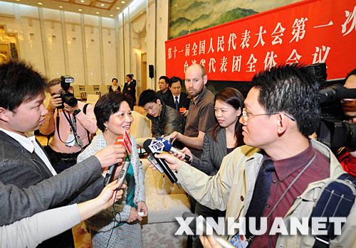 3月10日,出席十一屆全國人大一次會議的臺灣省代表團審議最高人民法院工作報告和最高人民檢察院工作報告。這是全國人大代表陳云英在接受記者采訪。新華社記者李濤攝