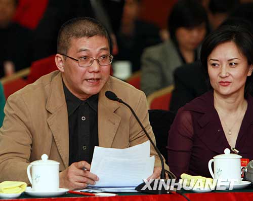 來自浙江的全國人大代表許江(左)在發(fā)言中呼吁,要用深含中國文化精髓的作品去開拓、占領(lǐng)國內(nèi)外市場。他說,繁榮文化市場,既要注重市場培養(yǎng),又要重視人才培養(yǎng)。新華社記者鞠鵬攝