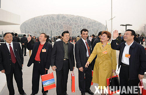 3月12日,出席全國政協十一屆一次會議的部分全國政協委員參觀北京奧運場館。這是委員們在國家體育場和國家游泳館外參觀。新華社記者黃敬文攝