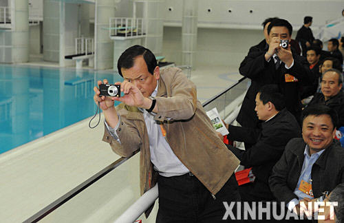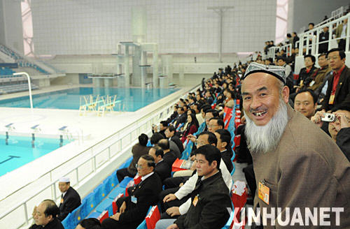 3月12日,出席全國政協十一屆一次會議的部分全國政協委員參觀北京奧運場館。這是白克力·馬木提委員(前右,維吾爾族)在國家游泳館內參觀。新華社記者黃敬文攝