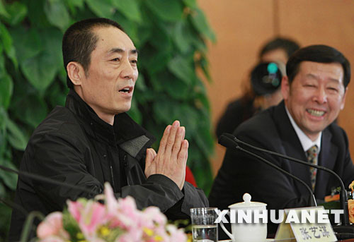 3月12日,全國政協十一屆一次會議在北京人民大會堂舉行記者招待會,主題是“政協委員談奧運”。這是張藝謀委員在記者招待會上。新華社記者龐興雷攝