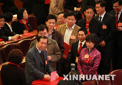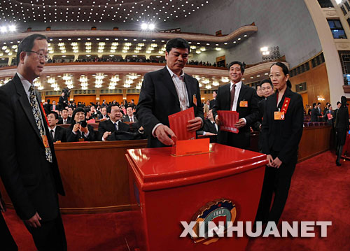 3月13日,全國(guó)政協(xié)十一屆一次會(huì)議在北京人民大會(huì)堂舉行第四次全體會(huì)議,選舉十一屆全國(guó)政協(xié)主席、副主席、秘書(shū)長(zhǎng)和常務(wù)委員。這是委員在投票。新華社記者饒愛(ài)民攝