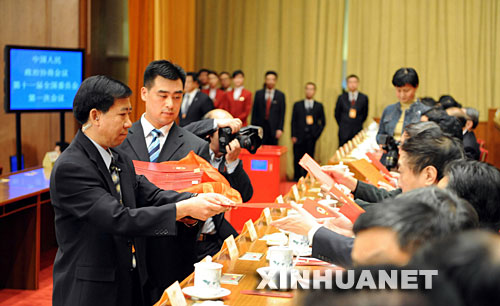 3月13日,全國政協十一屆一次會議在北京人民大會堂舉行第四次全體會議,選舉十一屆全國政協主席、副主席、秘書長和常務委員。這是工作人員在發選票。 新華社記者馬占成攝