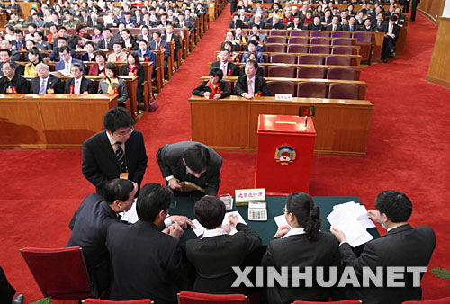 3月13日,全國政協十一屆一次會議在北京人民大會堂舉行第四次全體會議,選舉十一屆全國政協主席、副主席、秘書長和常務委員。這是工作人員在選票統計席上忙碌。新華社記者蘭紅光攝