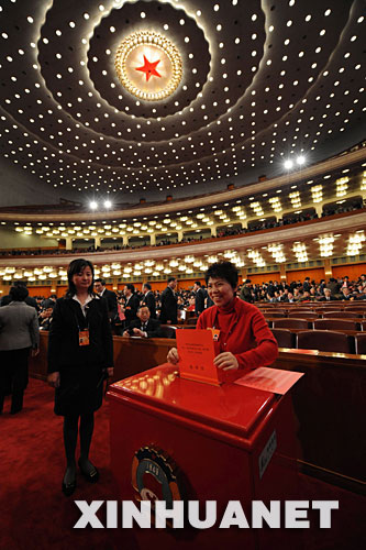 3月13日,全國政協十一屆一次會議在北京人民大會堂舉行第四次全體會議,選舉十一屆全國政協主席、副主席、秘書長和常務委員。這是鄧亞萍委員在投票。新華社記者馬占成攝