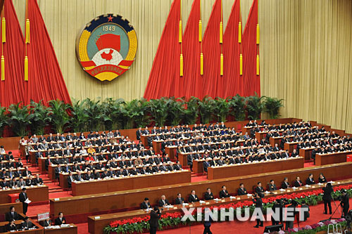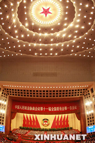 3月13日,全國政協十一屆一次會議在北京人民大會堂舉行第四次全體會議,選舉十一屆全國政協主席、副主席、秘書長和常務委員。這是大會會場。新華社記者龐興雷攝