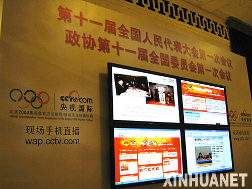 兩會(huì)期間,主要中央媒體紛紛在北京人民大會(huì)堂休息大廳“占據(jù)”有利地段,設(shè)置大屏幕,及時(shí)播報(bào)兩會(huì)最新消息。這是央視國(guó)際設(shè)置的大屏幕(3月13日攝)。新華社記者張燕輝攝