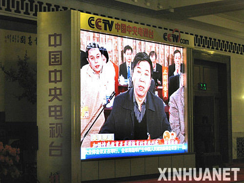 兩會(huì)期間,主要中央媒體紛紛在北京人民大會(huì)堂休息大廳“占據(jù)”有利地段,設(shè)置大屏幕,及時(shí)播報(bào)兩會(huì)最新消息。這是中央電視臺(tái)設(shè)置的大屏幕(3月13日攝)。新華社記者張燕輝攝