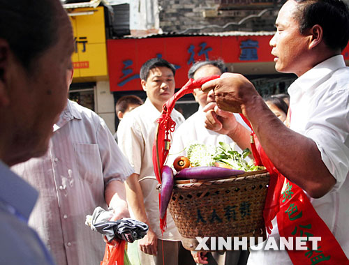 這是浙江省永嘉縣渠口鄉珠岸村村民提著菜籃子買菜(2007年4月13日攝)。新華社記者岳德亮、李亞彪報道
