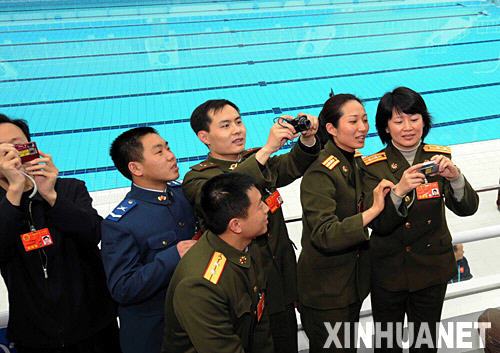 3月13日,全國人大代表在國家游泳中心“水立方”內拍照。