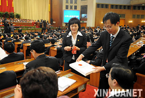 3月15日,十一屆全國(guó)人大一次會(huì)議在北京人民大會(huì)堂舉行第五次全體會(huì)議,選舉第十一屆全國(guó)人民代表大會(huì)常務(wù)委員會(huì)委員長(zhǎng)、副委員長(zhǎng)、秘書(shū)長(zhǎng);選舉第十一屆全國(guó)人民代表大會(huì)常務(wù)委員會(huì)委員;選舉中華人民共和國(guó)主席、副主席;選舉中華人民共和國(guó)中央軍事委員會(huì)主席。這是工作人員在發(fā)選票。新華社記者李學(xué)仁攝