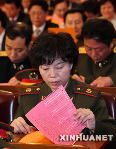 3月15日,十一屆全國(guó)人大一次會(huì)議在北京人民大會(huì)堂舉行第五次全體會(huì)議,選舉第十一屆全國(guó)人民代表大會(huì)常務(wù)委員會(huì)委員長(zhǎng)、副委員長(zhǎng)、秘書長(zhǎng);選舉第十一屆全國(guó)人民代表大會(huì)常務(wù)委員會(huì)委員;選舉中華人民共和國(guó)主席、副主席;選舉中華人民共和國(guó)中央軍事委員會(huì)主席。這是代表在查看選票。新華社記者劉衛(wèi)兵攝