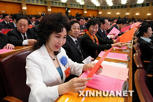 3月15日,十一屆全國(guó)人大一次會(huì)議在北京人民大會(huì)堂舉行第五次全體會(huì)議,選舉第十一屆全國(guó)人民代表大會(huì)常務(wù)委員會(huì)委員長(zhǎng)、副委員長(zhǎng)、秘書長(zhǎng);選舉第十一屆全國(guó)人民代表大會(huì)常務(wù)委員會(huì)委員;選舉中華人民共和國(guó)主席、副主席;選舉中華人民共和國(guó)中央軍事委員會(huì)主席。這是一位代表在查看選票。新華社記者馬占成攝