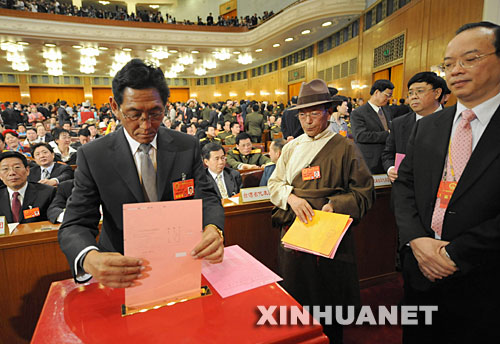 3月15日,十一屆全國人大一次會議在北京人民大會堂舉行第五次全體會議,選舉第十一屆全國人民代表大會常務(wù)委員會委員長、副委員長、秘書長;選舉第十一屆全國人民代表大會常務(wù)委員會委員;選舉中華人民共和國主席、副主席;選舉中華人民共和國中央軍事委員會主席。這是來自西藏的全國人大代表嘎瑪仁青(藏族)在投票。新華社記者馬占成攝