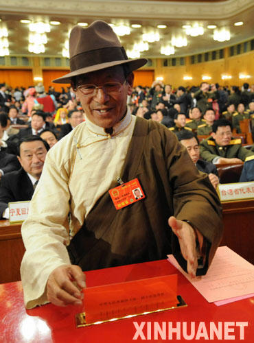 這是來自西藏的全國人大代表新雜·單增曲扎(藏族)在十一屆全國人大一次會議第五次全體會議上投票。 新華社記者馬占成攝