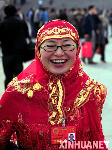 這是來自甘肅的全國人大代表畢紅珍(回族)在北京人民大會堂前。 新華社記者劉泉龍攝