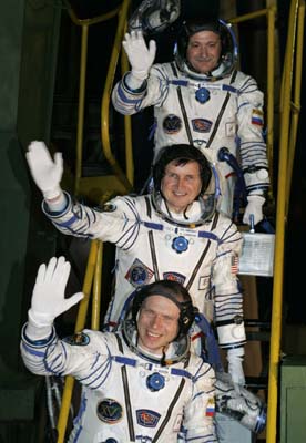 搭乘“聯盟”號飛往國際空間站的兩名俄羅斯宇航員和世界第五位太空游客、美國億萬富翁希莫尼(中)。