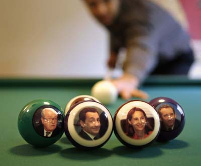 巴黎人在玩印有總統(tǒng)候選人頭像的臺球,圖中從左至右依次為勒龐、薩爾科奇、羅雅爾、貝魯。
