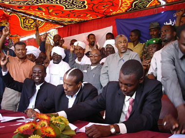 在整個簽字儀式過程中,主持人不停地將食指有力地指向頭頂,并且大聲重復著一些阿拉伯詞語。后來我從一個會一點英語的當地觀眾那里得知,他說的意思是“真主在上”,“和平!達爾富爾!”之類的話。當時的場面頗為熱烈,很多觀眾也跟著主持人做同樣的手勢,喊同樣的口號。