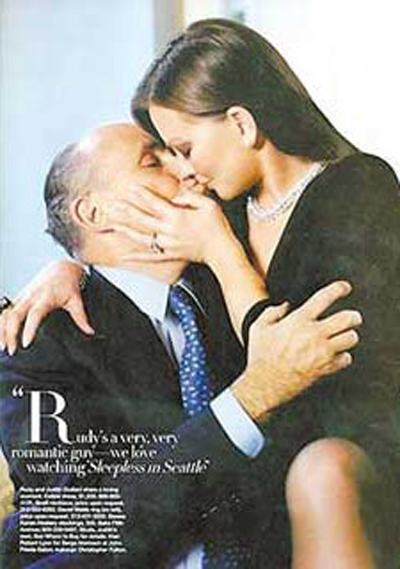 朱利安尼夫婦在一張今年3月刊登在《哈潑時尚》雜志的照片中大秀恩愛。照片中,朱利安尼的年輕嬌妻朱迪坐在老公椅臂上,低著頭、閉著眼,一手撫摸著老公臉頰,一手勾著他脖子親吻,姿態表情非常曖昧。朱迪還向該刊說:“我老公是個非常、非常浪漫的男人。”