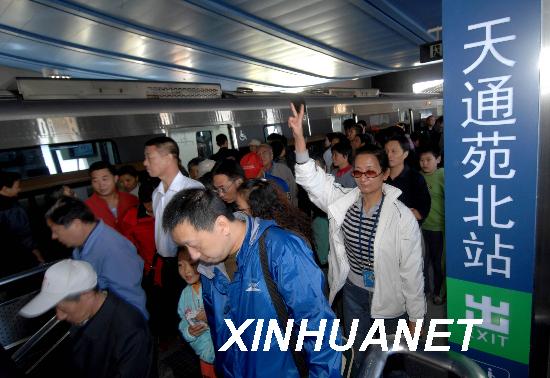 10月7日,乘坐北京地鐵5號線的乘客抵達終點站天通苑北站。當日14時,北京地鐵5號線正式開通試運營。5號線南起豐臺區(qū)宋家莊,北至昌平區(qū)天通苑,線路全長27.6公里,共有車站23座。新華社記者羅曉光攝