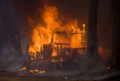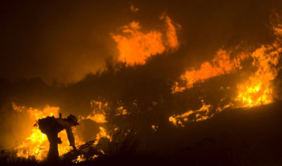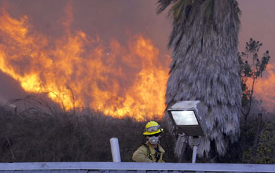 中國日報(bào)網(wǎng)環(huán)球在線消息:美國加利福尼亞州南部的大火在大風(fēng)的助長下繼續(xù)肆虐,不僅焚毀大片森林、燒毀數(shù)百座房屋,還導(dǎo)致近30萬人緊急撤離,其中不乏好萊塢巨星和名流。由于大風(fēng)、干旱等原因,截至當(dāng)?shù)貢r間10月22日,火勢仍然未得到有效控制,上千名國民警衛(wèi)隊(duì)員已參與救災(zāi),布什總統(tǒng)也被驚動了。
