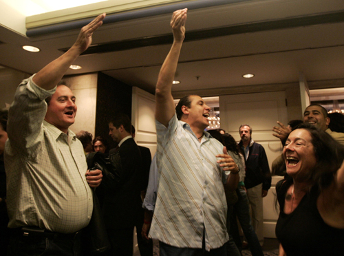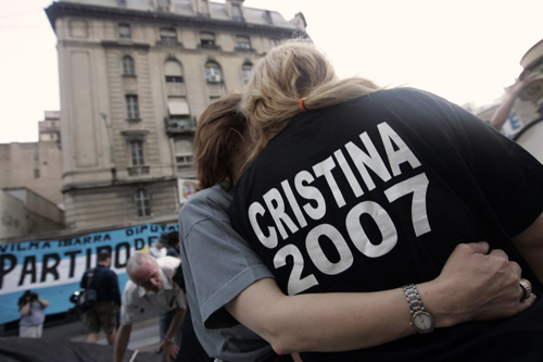 民調顯示克里斯蒂娜·費爾南德斯在總統選舉中獲勝,克里斯蒂娜的支持者相互擁抱慶祝勝利。