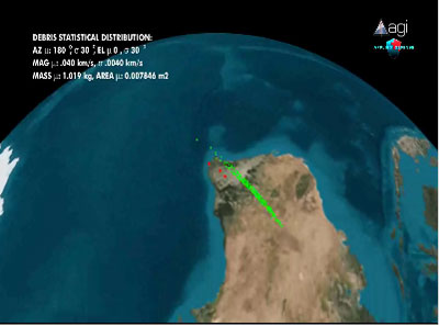 衛(wèi)星被導(dǎo)彈摧毀后,碎片(綠色)將繼續(xù)繞地球飛行,并在進(jìn)入大氣層時(shí)燃燒殆盡(紅色)。