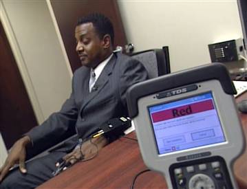 這種測謊器大名叫“初步可信性評估審查系統”,小巧玲瓏,可以輕便地拿在手中。在使用時,將三根數據線連在被測試者的手上,由翻譯人員用阿拉伯語、波斯語或者普什圖語詢問他20個左右的問題,比如:“你是否準備如實回答我的問題?”,“這個房間里的燈開著嗎?”,“你是塔利班成員嗎?”等等。