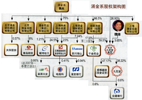 盡管魏東本人行事極其低調(diào),但他的涌金卻以令人瞠目的擴(kuò)張速度,備受業(yè)界關(guān)注。1994年上半年,魏東下海成立北京涌金財經(jīng)顧問有限公司。最初公司叫金涌,取金融諧音,但交到北京市工商局核對時發(fā)現(xiàn)有重名,魏東隨口倒換了一下,稱作涌金。這是流傳于金融界的一段涌金系的小插曲。一年后,北京涌金即以2億元注冊資金在上海成立上海涌金實業(yè)公司,魏東先后通過炒國債、轉(zhuǎn)配股、法人股受讓、配售新股積累了大量財富。1999年,魏東又以1.8億元注冊湖南涌金投資(控股)有限公司,這后來成為涌金系的核心投資平臺。2002年是涌金系的轉(zhuǎn)折點(diǎn),這一年,涌金轉(zhuǎn)向?qū)ι鲜泄镜氖召彛_始進(jìn)入實業(yè)領(lǐng)域,控股九芝堂,成為千金藥業(yè)的第二大股東。2005年,當(dāng)中國股市尚處一片低迷時,魏東看準(zhǔn)券商在中國不可復(fù)制的“牌照”資源,控股成都證券,并改名為國金證券。2007年,國金證券借殼成都建投上市,首日暴漲129.6%,成為金融第一高價股。